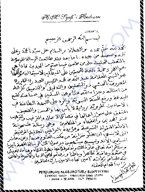 الحمد لله حق حمده والصلاة والسلام على سيدنا محمد وعلى ءاله وصحبه من بعده. أما بعد فقد طالعت الرسالة الموسومة بـ "التعقب الحثيث على مَن طعن فيما صح من الحديث" فإذا هي نِعم الفخر وحجة بالغة للمحققين على المبطلين لا سيما أن مؤلفها هو الشيخ العلامة عبد الله بن محمد الشيبي العبدري الهرري المعروف بالحبشي ذو التحقيق والتدقيق والتنميق كثـّر الله من أمثاله ، وجزاه الله عنا وعن المسلمين في صناعته لقمع البدعة ورفع السنة النبوية والرد على الشبهة الطاعنة في الأحاديث المروية برواية لا بأس بها والحسن ، والضعيف المتفق على جواز إعمالها في فضائل الأعمال والترغيب والترهيب عند المحدثين والفقهاء والمتكلمين. وهي رسالة مشحونة بالأدلة المنقولة الشرعية ومؤيدة بالبراهين العقلية المرضية التي لا ينبغي أن يخلو خزانة من مكتب العلوم عنها . ونحن معاشر المسلمين الأندونيسيين مبتهجون بوصول تلك الرسالة المهمة إلى أيدينا ونشكر الله تعالى على ذلك وندعو لمؤلفها بطول البقاء وهناءة العيش في صحة وعافية ظاهراً وباطناً ورضا مولاه في الدنيا والآخرة وأفاض الله علينا من بركاته ءامين بجاه سيدنا محمد الأمين يا رب العالمين.